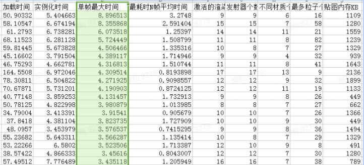 IEnumerator AnalyseSingleFx(GameObject fxObj,float fxLoadTime, string fxPath) { var report =new EffectPerformance(); reports.Add(report); report.Path = fxPath; System.GC.Collect(); AsyncOperation ao = Resources.UnloadUnusedAssets(); yield return ao; yield return new WaitForEndOfFrame(); //加载 float t1 = 0;// float t1 = Time.realtimeSinceStartup;// //GameObject fxObj = null;// //var fxRes = App loadobject// report.LoadTime = Time.realtimeSinceStartup - t1;// yield return new WaitForEndOfFrame(); report.LoadTime = fxLoadTime; if(fxObj==null) yield break; report.totalPsCount = fxObj.GetComponentsInChildren (true).Length; Renderer[] fxRenderers = fxObj.GetComponentsInChildren (); Dictionary fxMaterials = new Dictionary (); int active = 0; foreach (var r in fxRenderers) { bool has = false; if(r.sharedMaterial!=null && fxMaterials.TryGetValue(r.sharedMaterial,out has)==false){ fxMaterials.Add(r.sharedMaterial,true); } if (r.enabled) active++; } report.activeRendercount = active; report.materialCount = fxMaterials.Count; yield return new WaitForEndOfFrame(); GameObject someFxInst = null; t1 = Time.realtimeSinceStartup; //实例化 for (int i = 0; i < testCount; i++) { GameObject go = Instantiate(fxObj); go.transform.position = Vector3.zero; fxCopies.Add(go); if (i == 0) someFxInst = go; } report.InstTime = (Time.realtimeSinceStartup - t1) * 1000f / testCount; ParticleSystem[] psInsts = someFxInst.GetComponentsInChildren (); //渲染,只采样一个?? yield return new WaitForEndOfFrame(); yield return new WaitForEndOfFrame(); yield return new WaitForEndOfFrame(); float t4 = 0; int frame = 0; report.MinRenderTime = float.MaxValue; report.MaxRenderTime = float.MinValue; List timeList = new List (); while (t4 report.MaxRenderTime) { report.MaxRenderTime = dt; report.maxRenderOccurTime = t4; } timeList.Add(dt*1000); t4 += dt; int particleCount = 0; for (int i = 0; i < psInsts.Length; i++ ) { particleCount += psInsts[i].particleCount; } if (report.maxParticleCount < particleCount) report.maxParticleCount = particleCount; yield return new WaitForEndOfFrame(); } report.MinRenderTime *= 1000 / testCount; report.maxRenderOccurTime *= 1000 / testCount; timeList.Sort(); timeList.Reverse(); float avg = 0; int topN = Mathf.Min(topNFrame, timeList.Count); for(int i=0;i texNames = GetTextureMemAndCount(); foreach (var t in texNames) { if (localTexNames.ContainsKey(t.Key) == false) { report.TexNameList.Add(t.Key,t.Value); report.texMemBytes +=t.Value.bytes; report.texMemCount++; } } //清理// foreach (var fx in fxCopies)// {// UnityEngine.Object.DestroyImmediate(fx);// }// fxCopies.Clear(); reportDoneCount++; Debug.Log("完成测算过+1"); yield return new WaitForEndOfFrame(); } public class EffectPerformance{ public string Path; /// /// 加载时间 /// public float LoadTime; /// /// 平均实例化时间 /// public float InstTime; public float MinRenderTime; public float MaxRenderTime; //最长渲染帧耗时 public float topNFramesAvgRenderTime; public float maxRenderOccurTime; //渲染的最长时间的一帧发生在第几秒 /// /// 激活的渲染个数 /// public int activeRendercount; //激活的渲染个数 public int totalPsCount; //全部粒子个数,包括未激活 public int materialCount; //材质个数 public int maxParticleCount; //最大粒子个数 public int texMemBytes; //所用贴图内存 public int texMemCount; //所用贴图个数 public Dictionary TexNameList = new Dictionary ();}